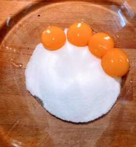- Fouettez les jaunes d'œuf avec le sucre en poudre pour les blanchir