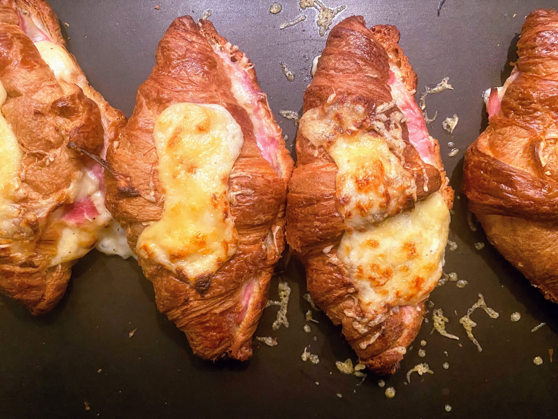 Alors, nous allons utiliser des croissants rassis (de la veille), de belles tranches de jambon et une béchamel au Comté AOP. Après un passage rapide dans votre four, vous obtiendrez de délicieux croissants farcis !