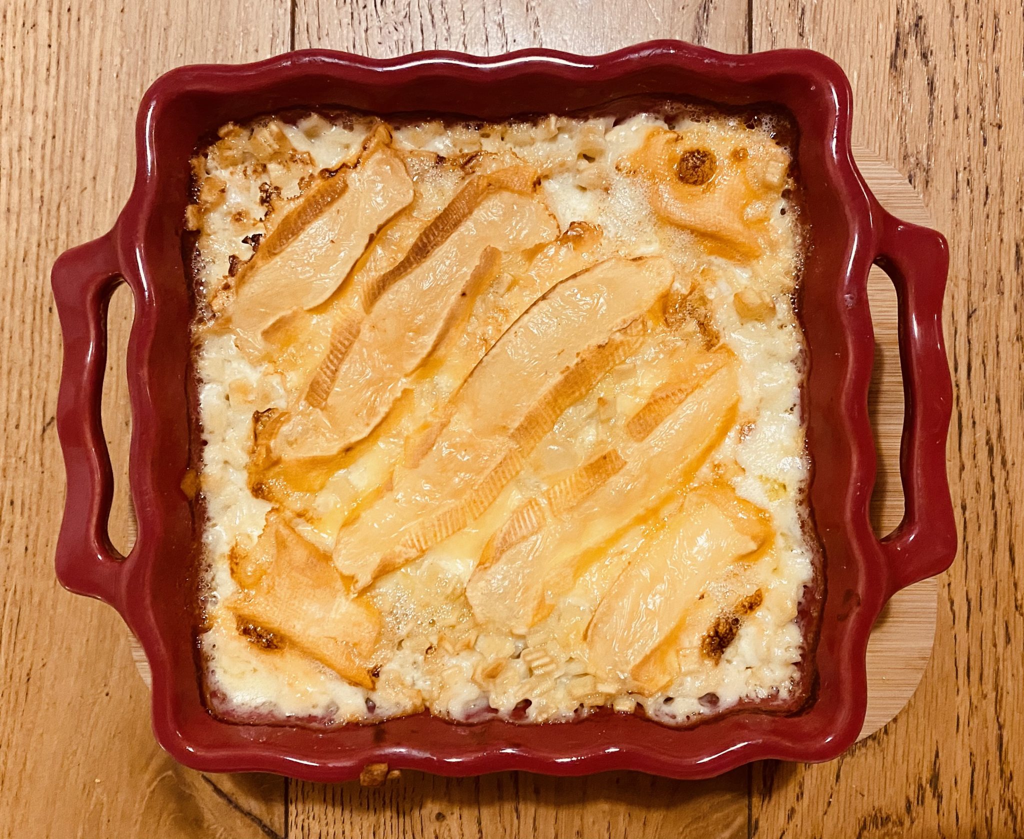 - Versez la deuxième ½ de vos crozets et le reste du mélange crème, oignons & lardons.