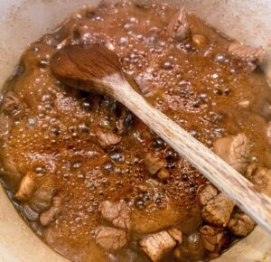 - Rajoutez la viande dans le sirop à feu vif et mélangez pour que ça n'accroche pas jusqu'à évaporation complète de l'eau