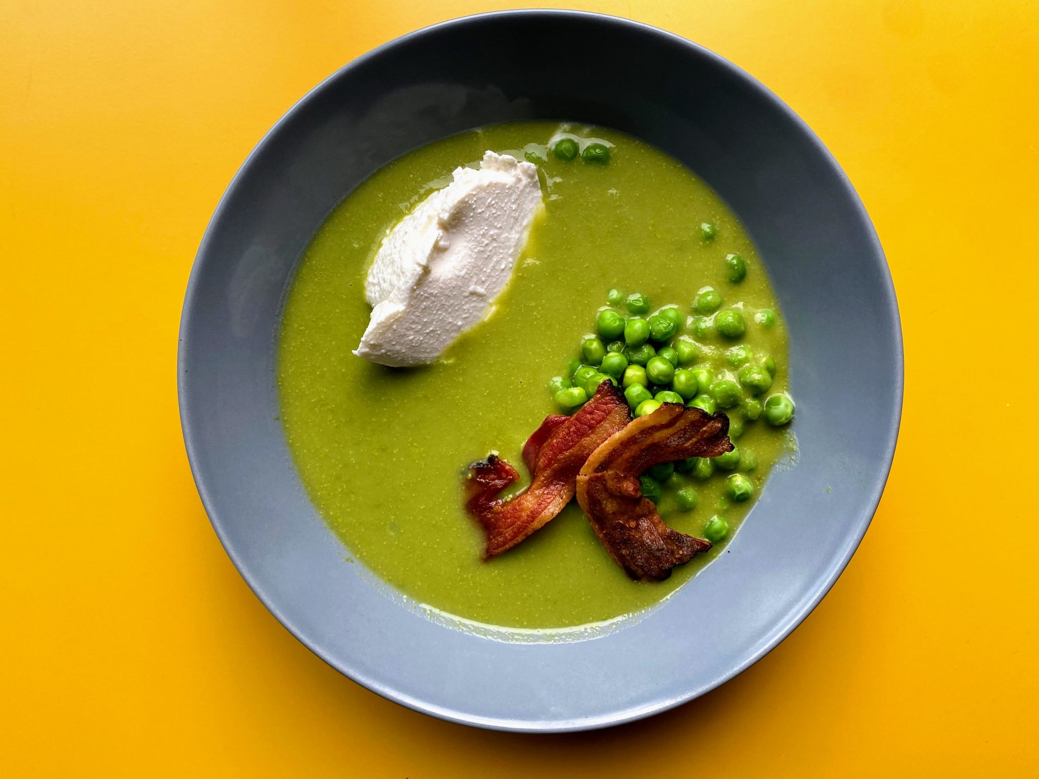 Velouté de cosses de petits pois avec ricotta et poitrine fumée